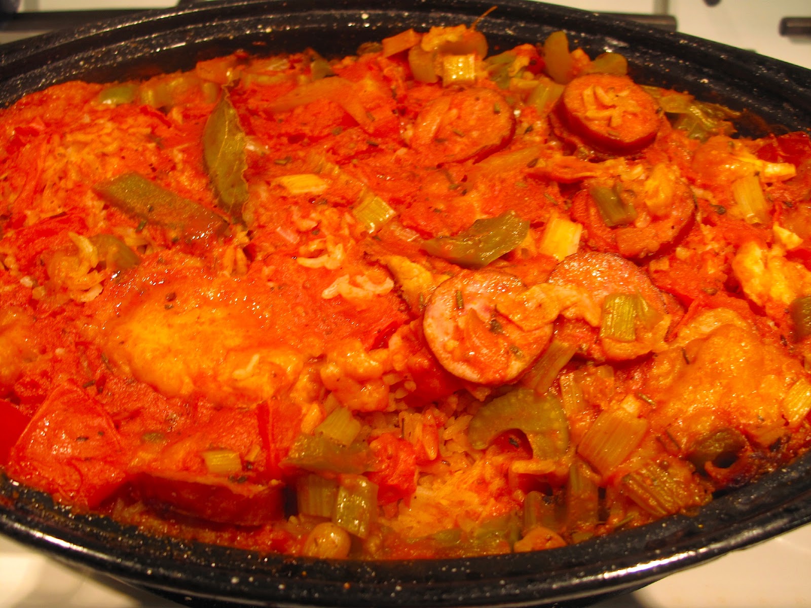 And looking at the recipe, it is not much different than any Jambalaya recipe I made or tasted. In fact, Jambalaya by nature of its name is a mix of meats and vegetables with spices and rice.